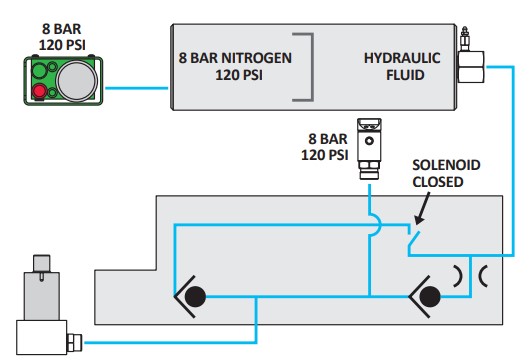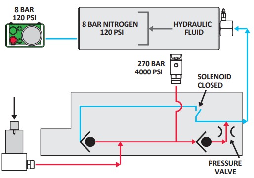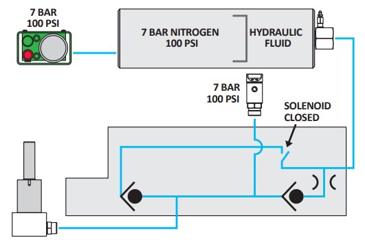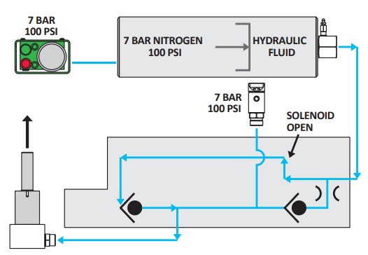 4. The Solenoid opens and nitrogen pressure in the accumulator pushes fluid back to the cylinder which returns to the raised position. The system is reset and ready for the next cycle.